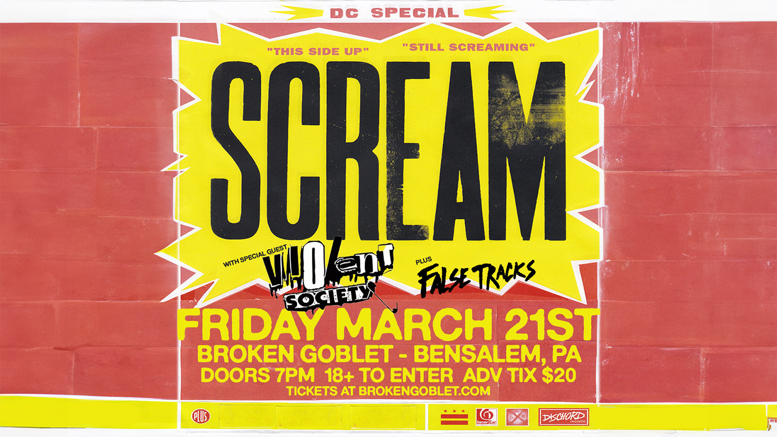 FW Shows and Broken Goblet present Washington DC and Dischord Records punk legends Scream with special guest Violent Society and False Tracks.