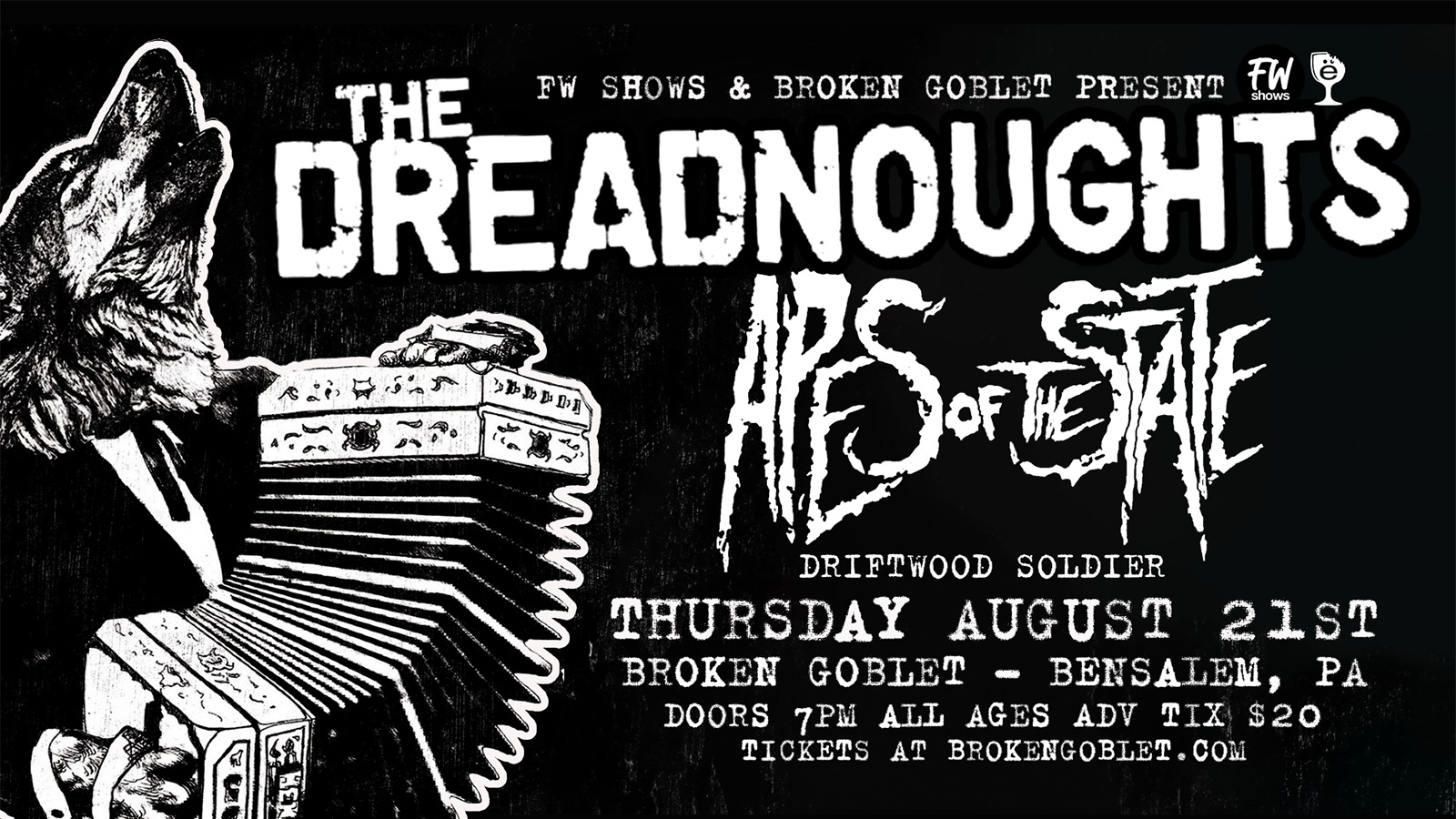 FW Shows and Broken Goblet are excited to welcome back the spirited sounds of Vancouver folk-punk band The Dreadnoughts, the charismatic indie folk of Apes of the State, and mandolin driven gutter folk of Driftwood Soldier.